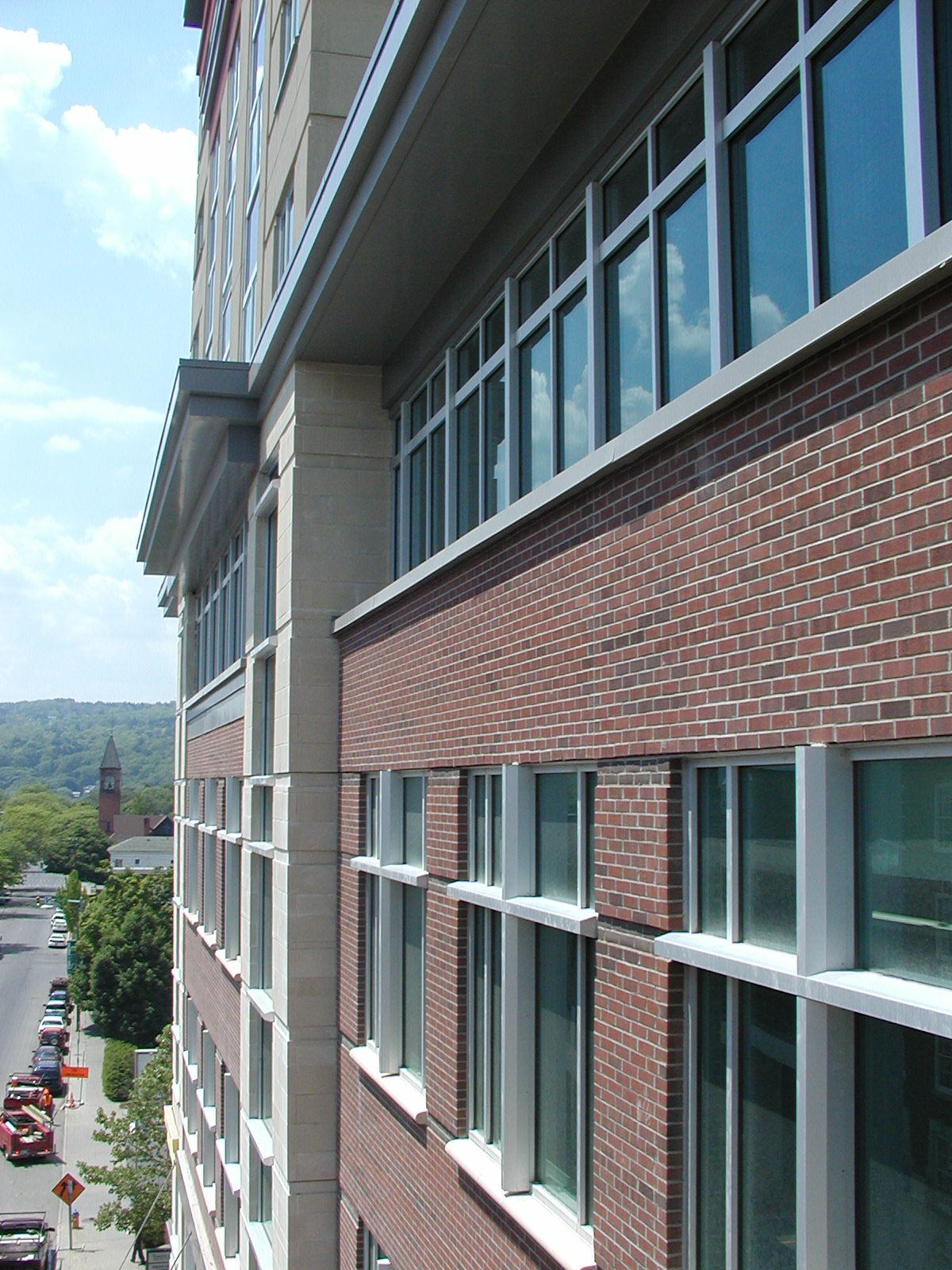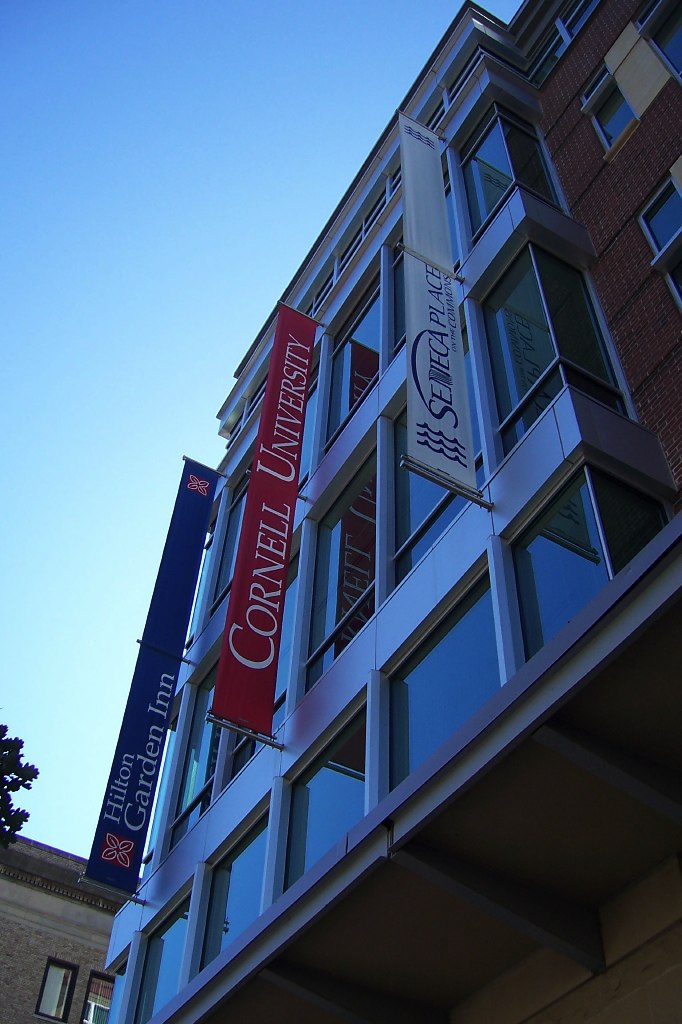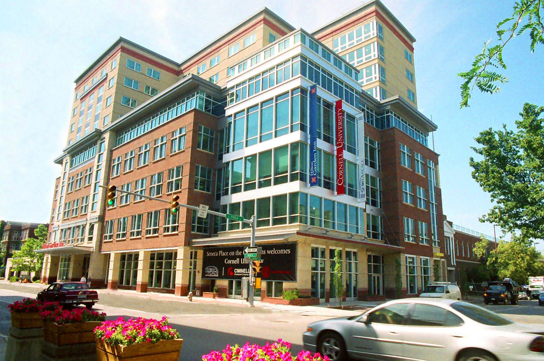 The first level rewards the passing pedestrian with food and coffee from the retail spaces, and a protected roof over Seneca Street sidewalk. The users of the building include several hundred employees of Cornell’s Alumni Department and the Johnson School of Business on the second through fourth floors. The fifth floor has multiple financial services tenants. The upper four floors house a 104 room Hilton Garden Inn.