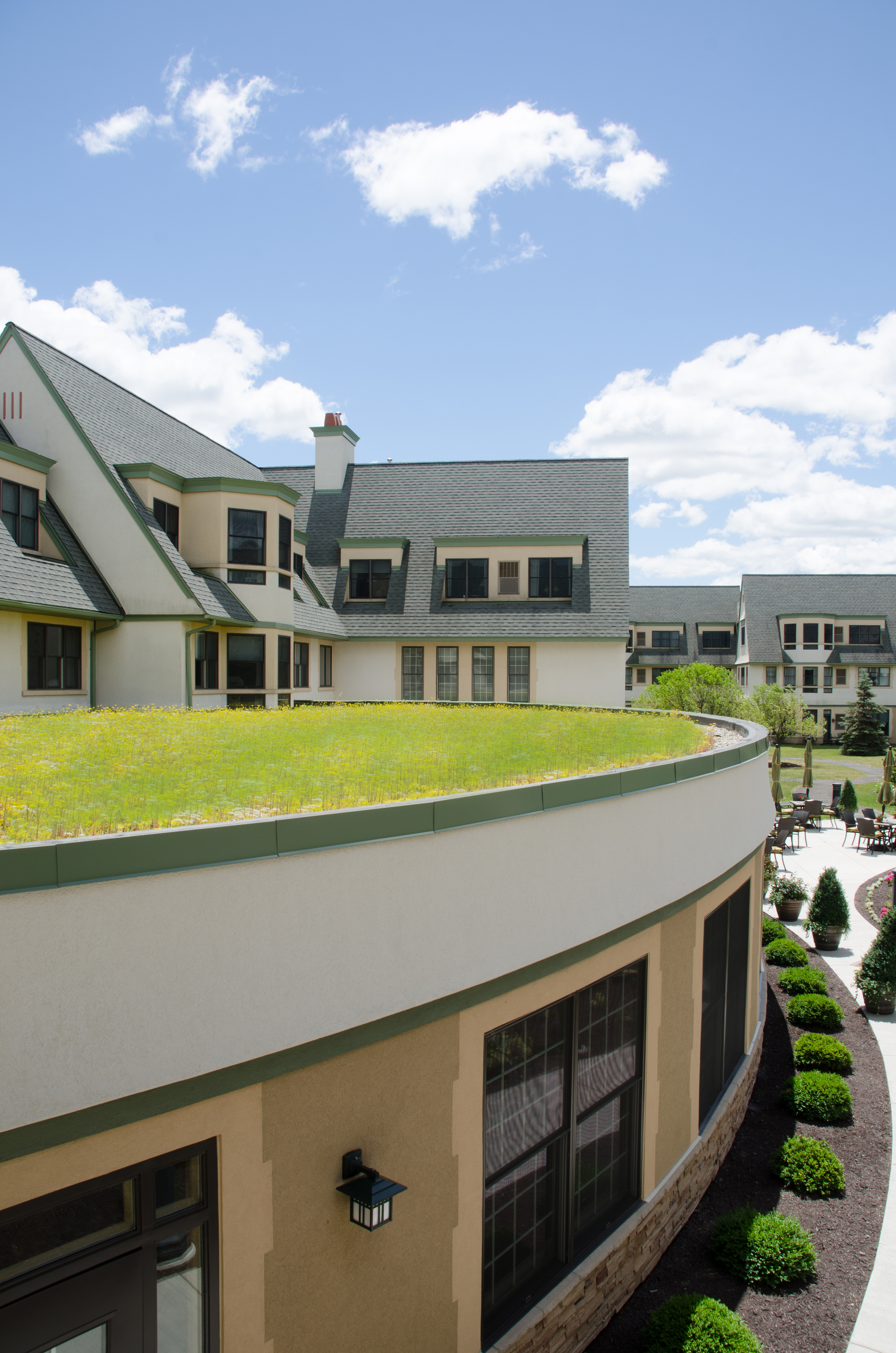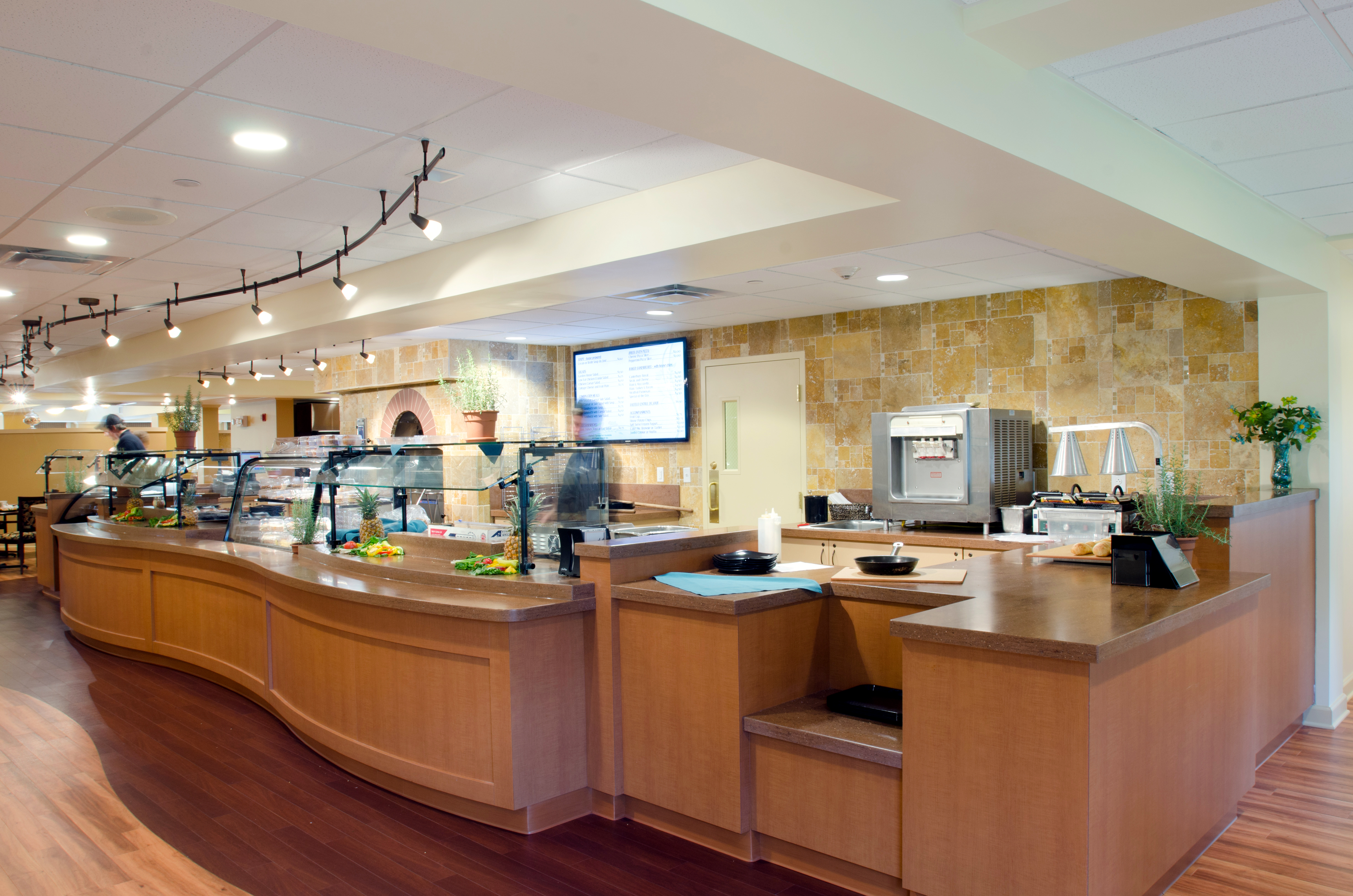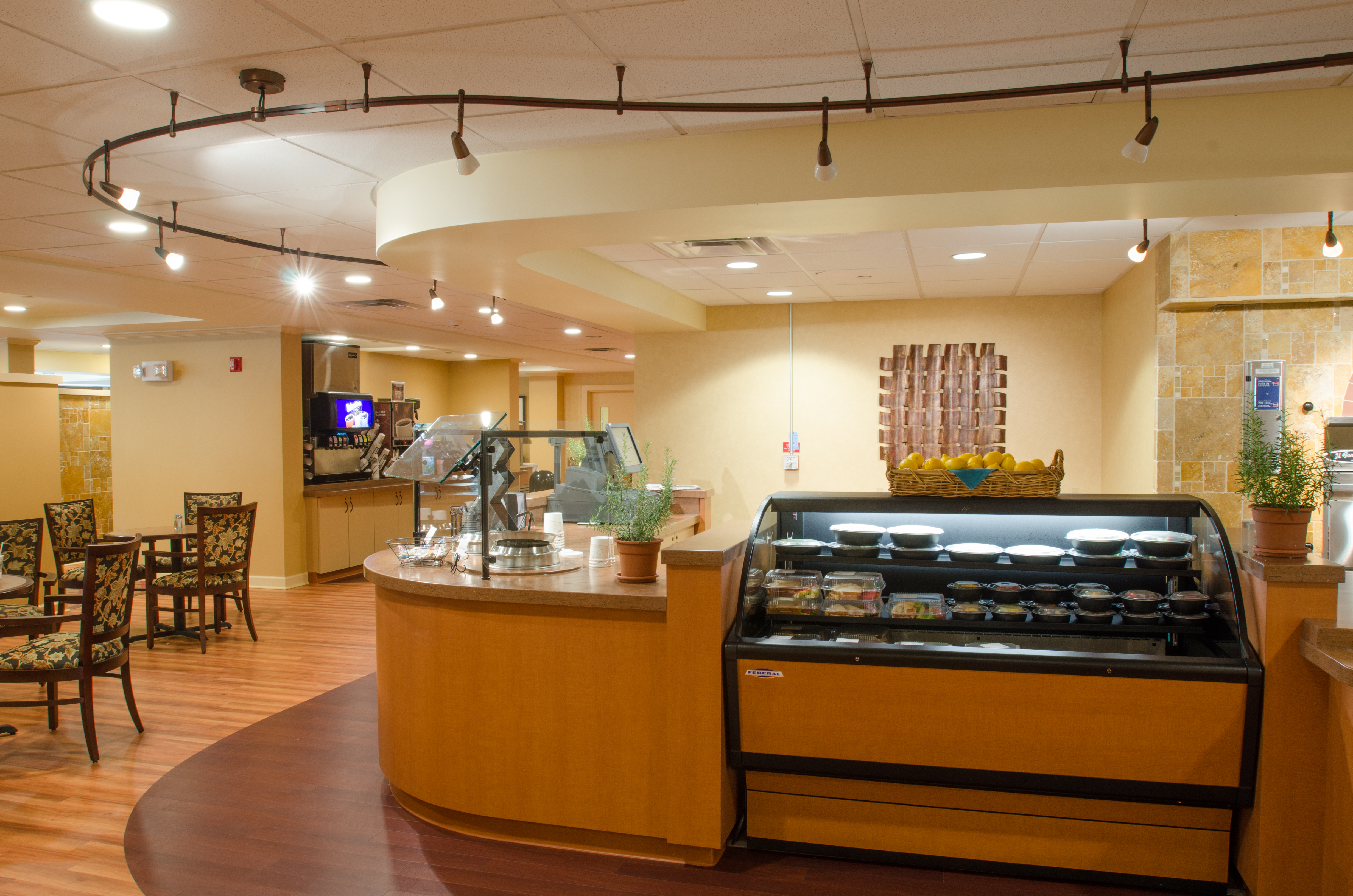 Renovation of the existing space provides additional casual seating choices around the new café, while the existing formal dining area was opened to create circulation and visual flow, integrating all spaces into the dining experience. An evaluation of the existing kitchen layout resulted in its redesign for a more efficient and appropriate staff circulation reducing the chance for cross contamination of food. A vegetative roof was included as part of the design to enhance the new roofscape for the resident’s apartments above.