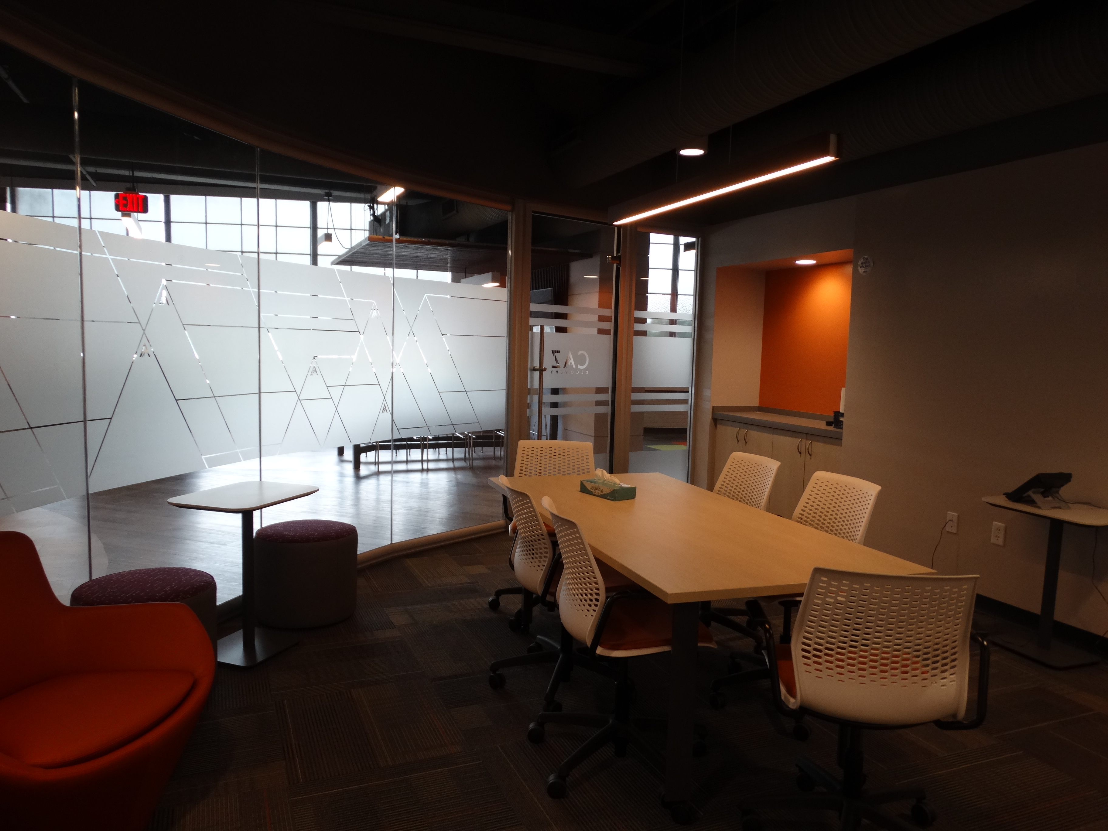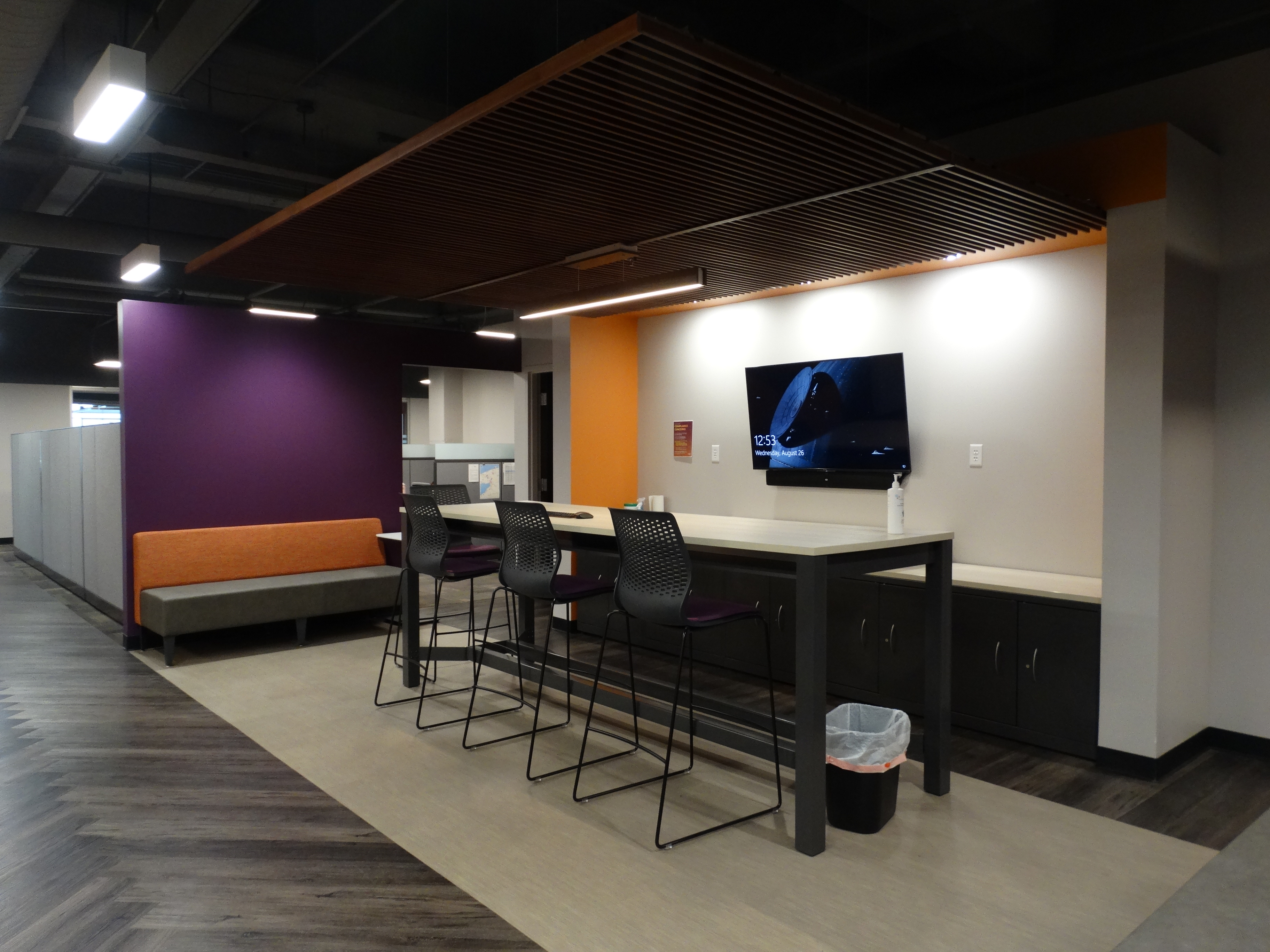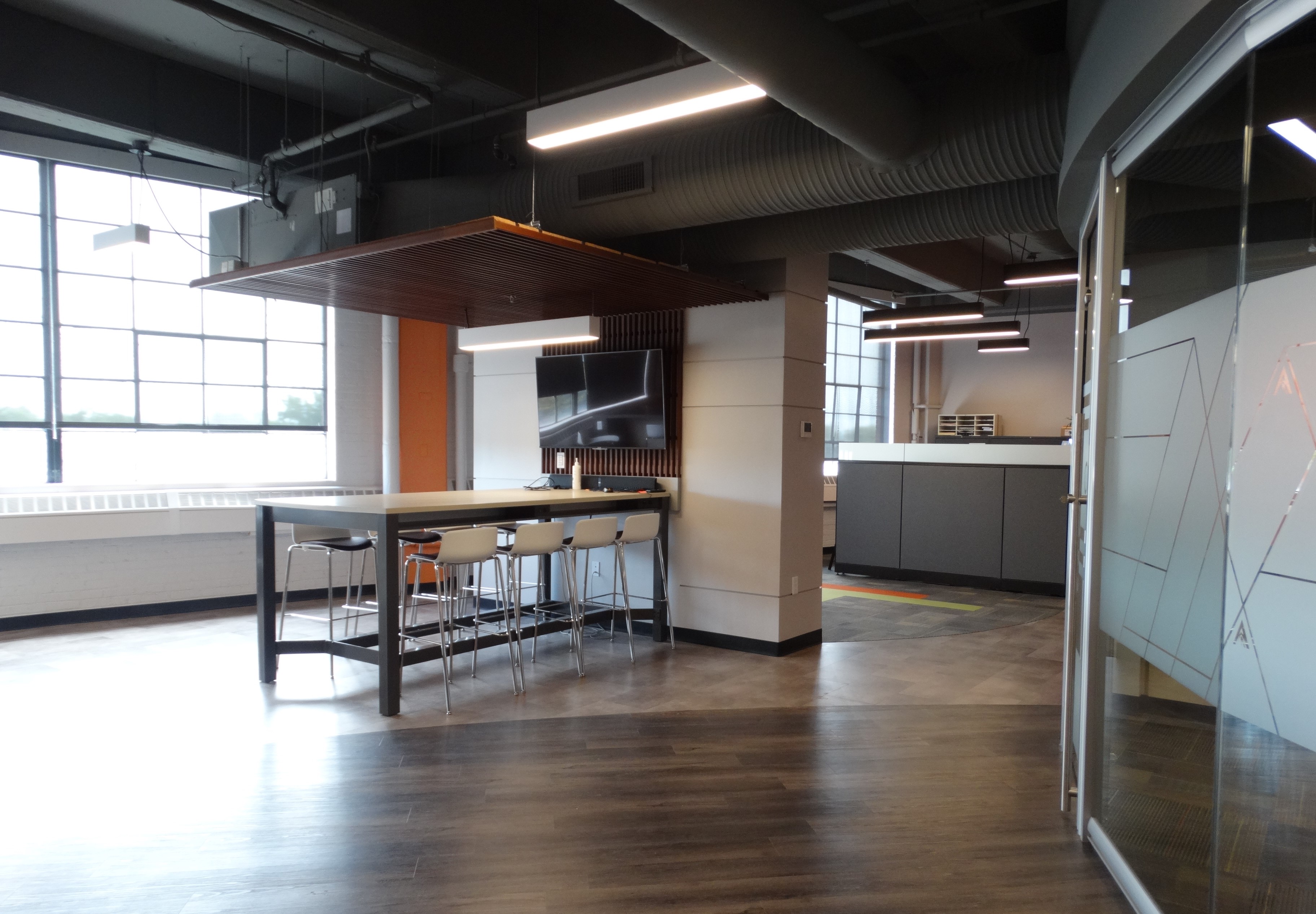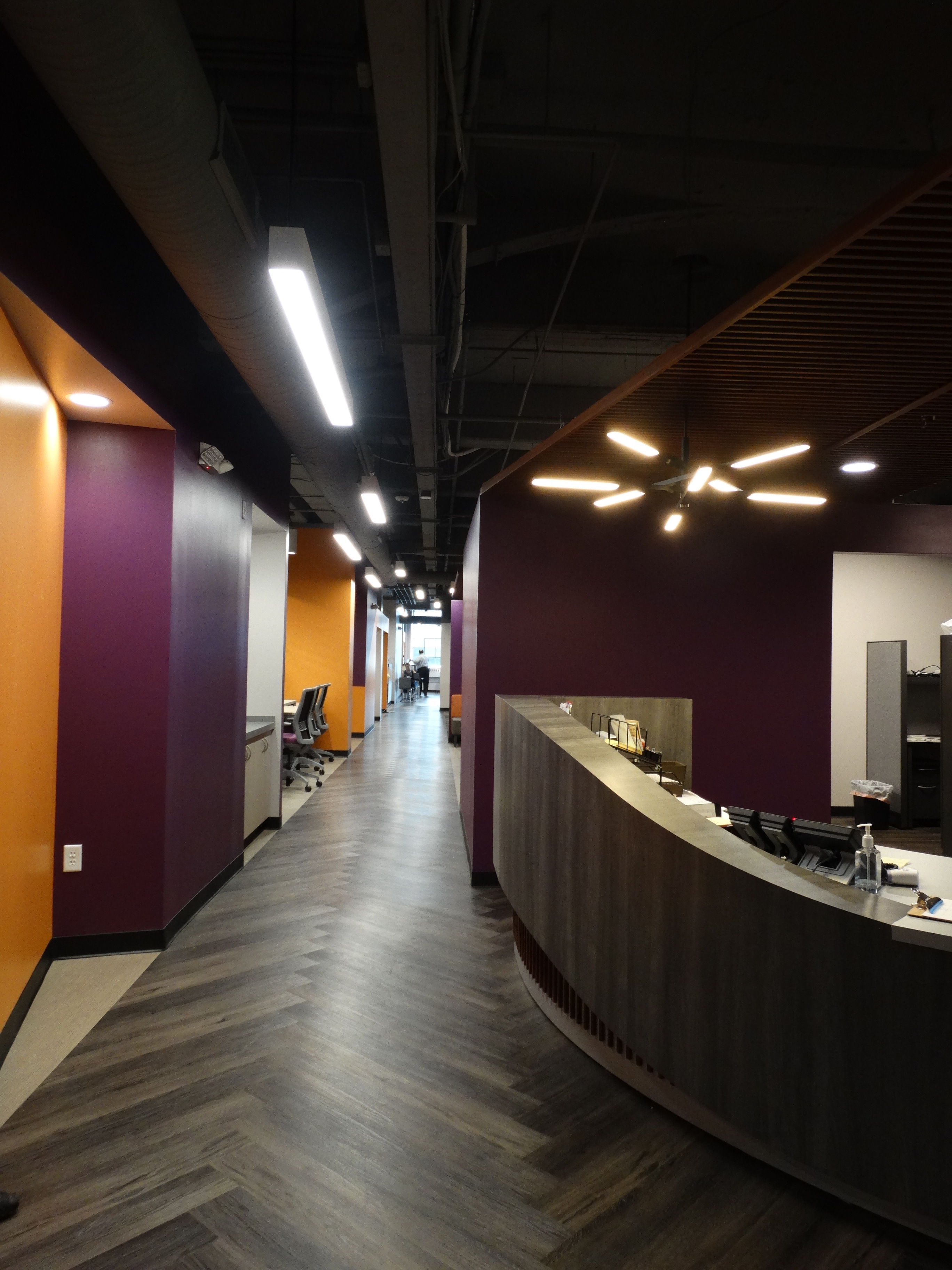 This 7,800 square foot build-out features an open office work flow with complementary break-out and work spaces. To afford privacy for clientele and business operations, the appropriate departments have dedicated and enclosed areas. To meet the growing desire for flexible work spaces, standing desk areas and break-out desks have been included within the floor plan. In the 1920’s The TriMain Building was home to a Ford plant which produced Model Ts, so the design looks to be a contemporary blend of wood, glass, and exposure of the original concrete structure. The bright colors and linear patterns are a continuation of the graphics and branding.