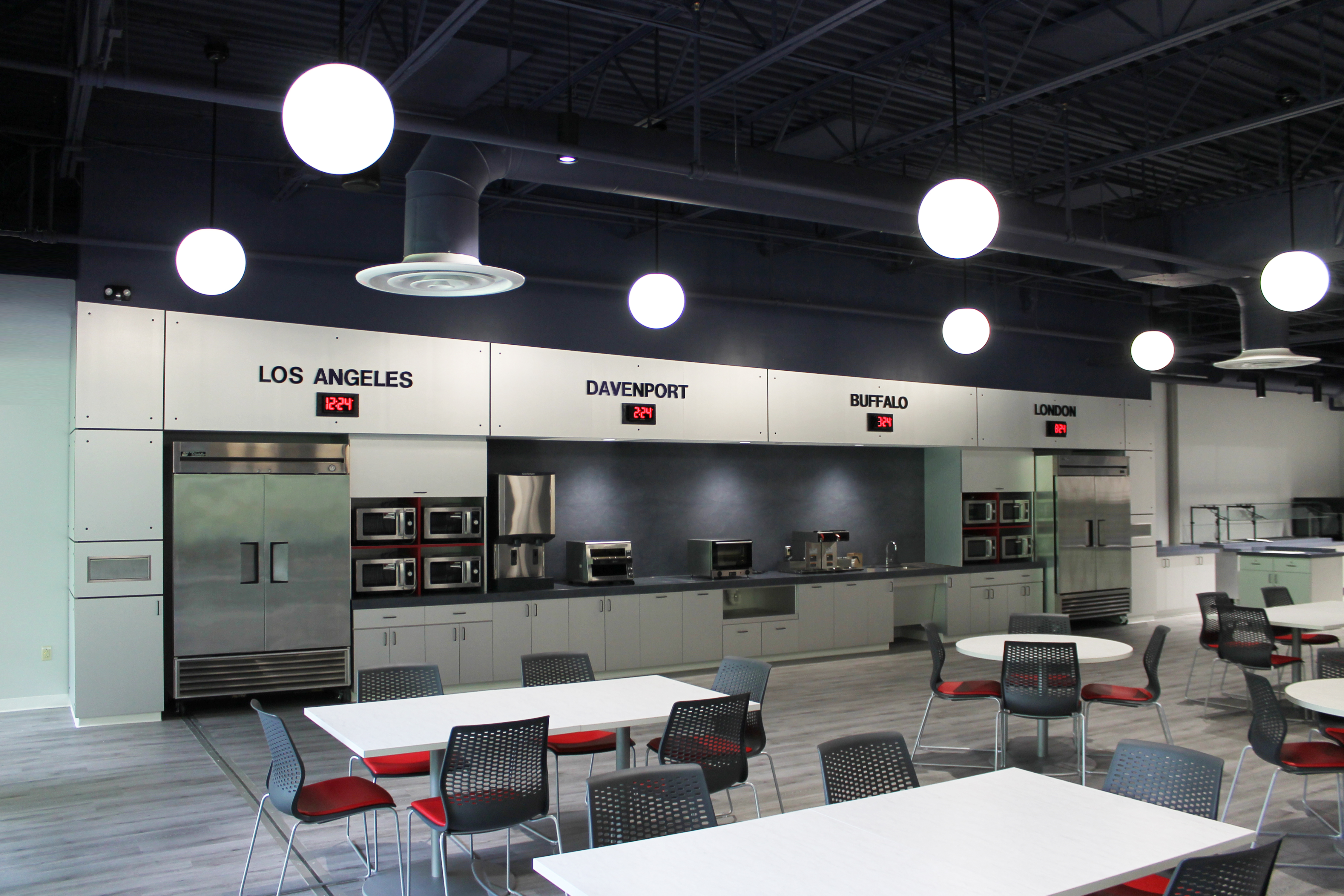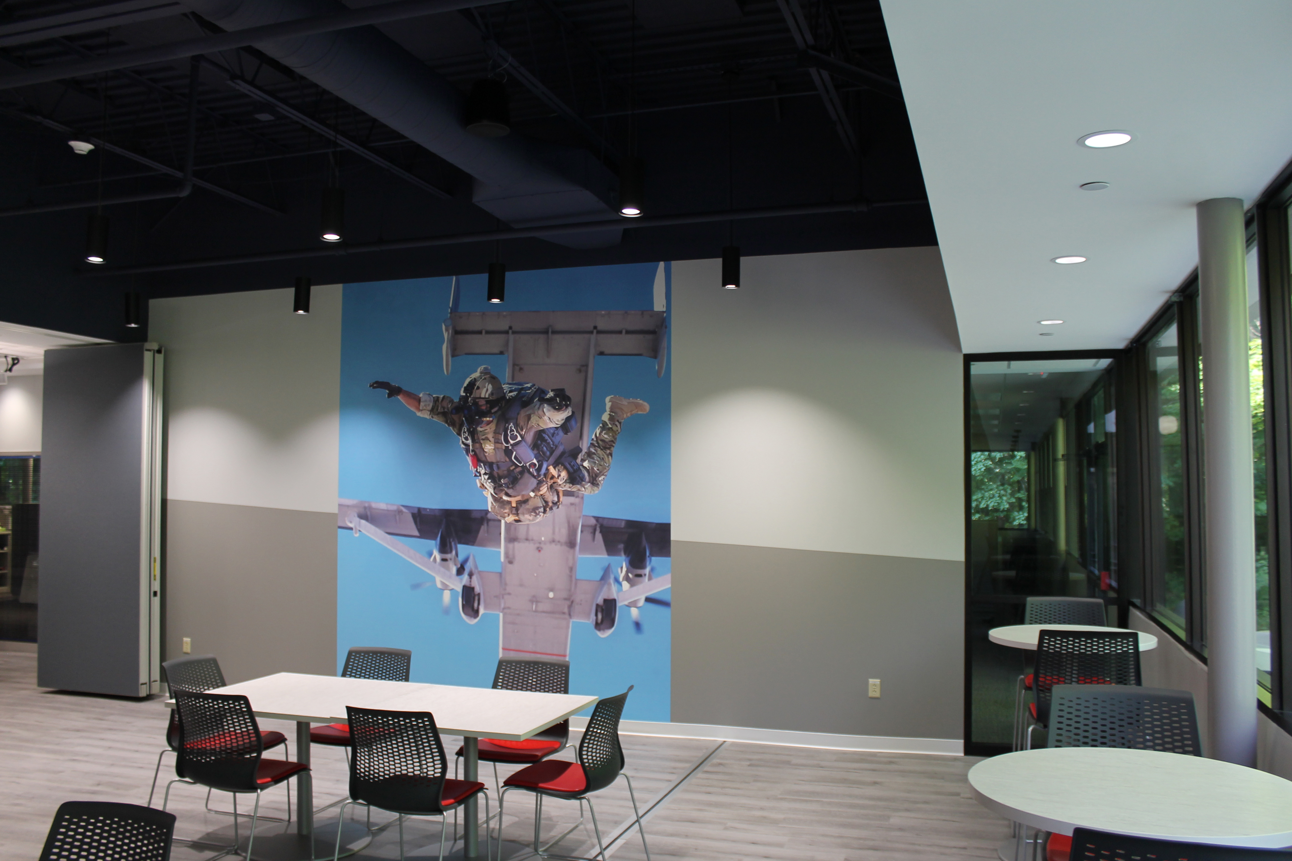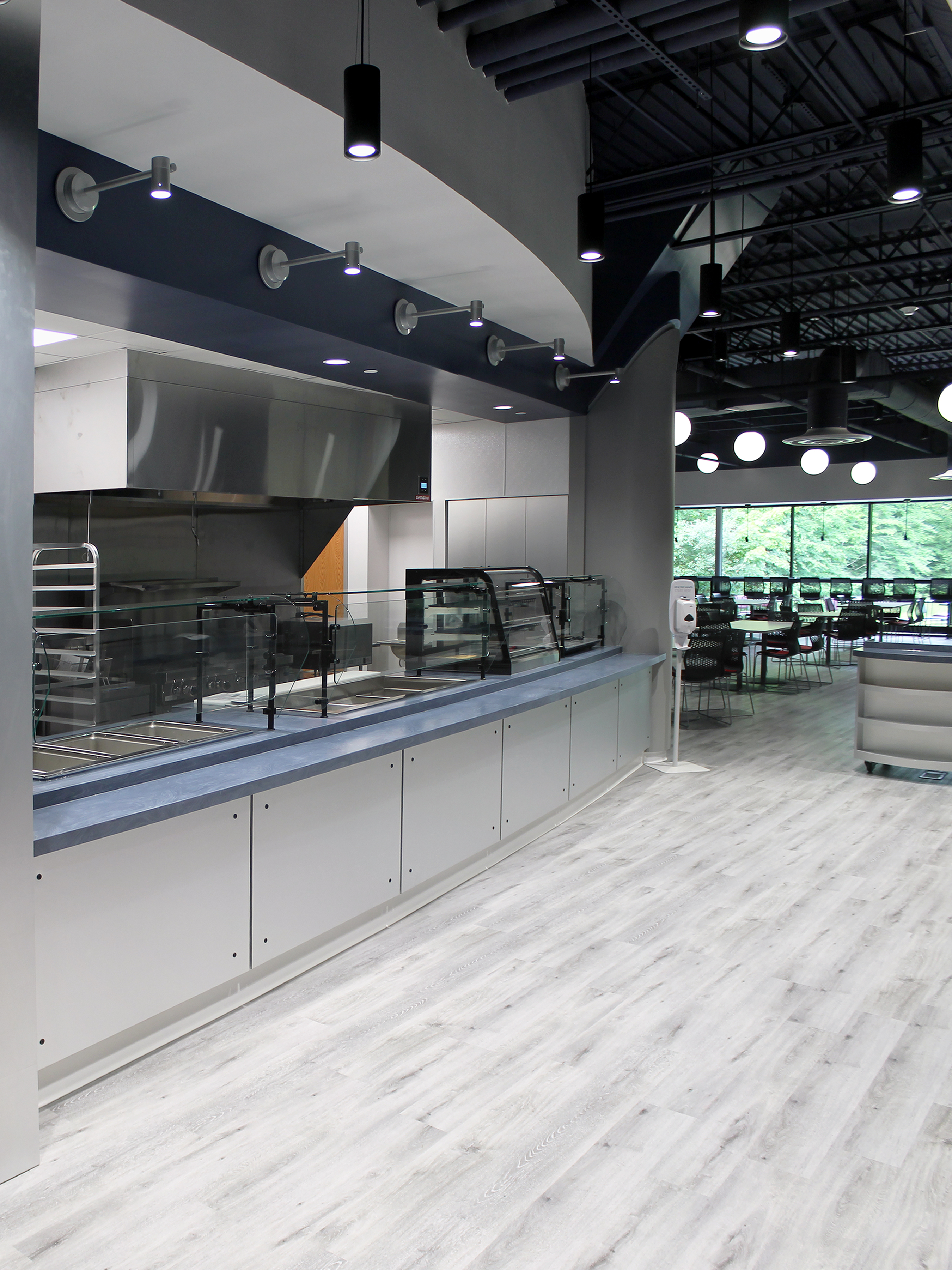 To accommodate employee growth and enhance the employee experience at Cobham Mission Systems in Orchard Park, a renovation and expansion of their existing cafeteria facilities was completed in 2020. The 5,300 sf aerospace themed renovation includes a new commercial kitchen with serving line, employee kitchenette, cafeteria seating, game area, conference flex spaces, and presentation feature wall for large company wide meetings.