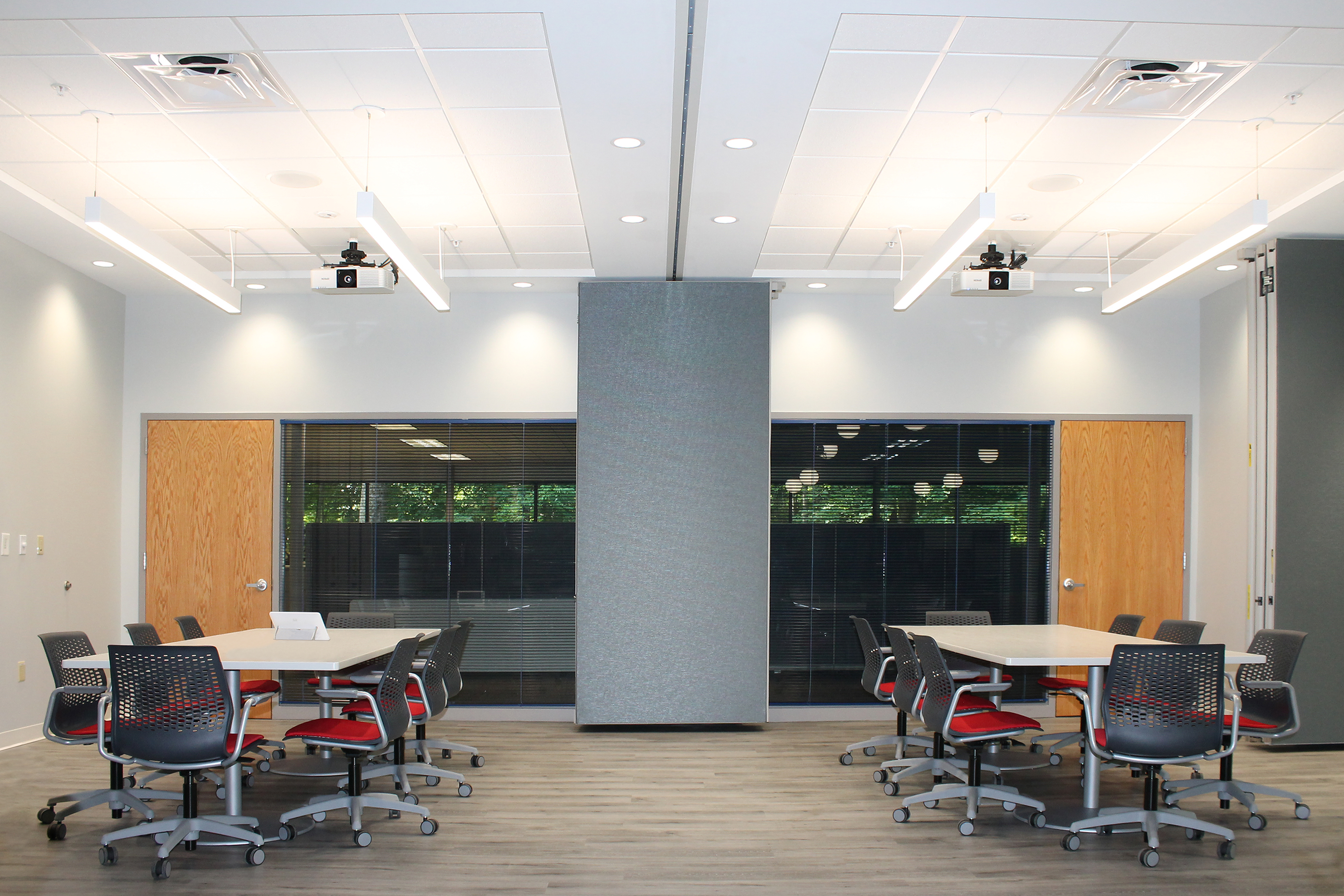 In order to achieve the maximum flexibility of the main cafeteria space, studies of furniture layouts were conducted in order to satisfy the needs of the client to execute multiple modes of functionality between the general cafeteria seating, company wide meetings, and conference room areas.