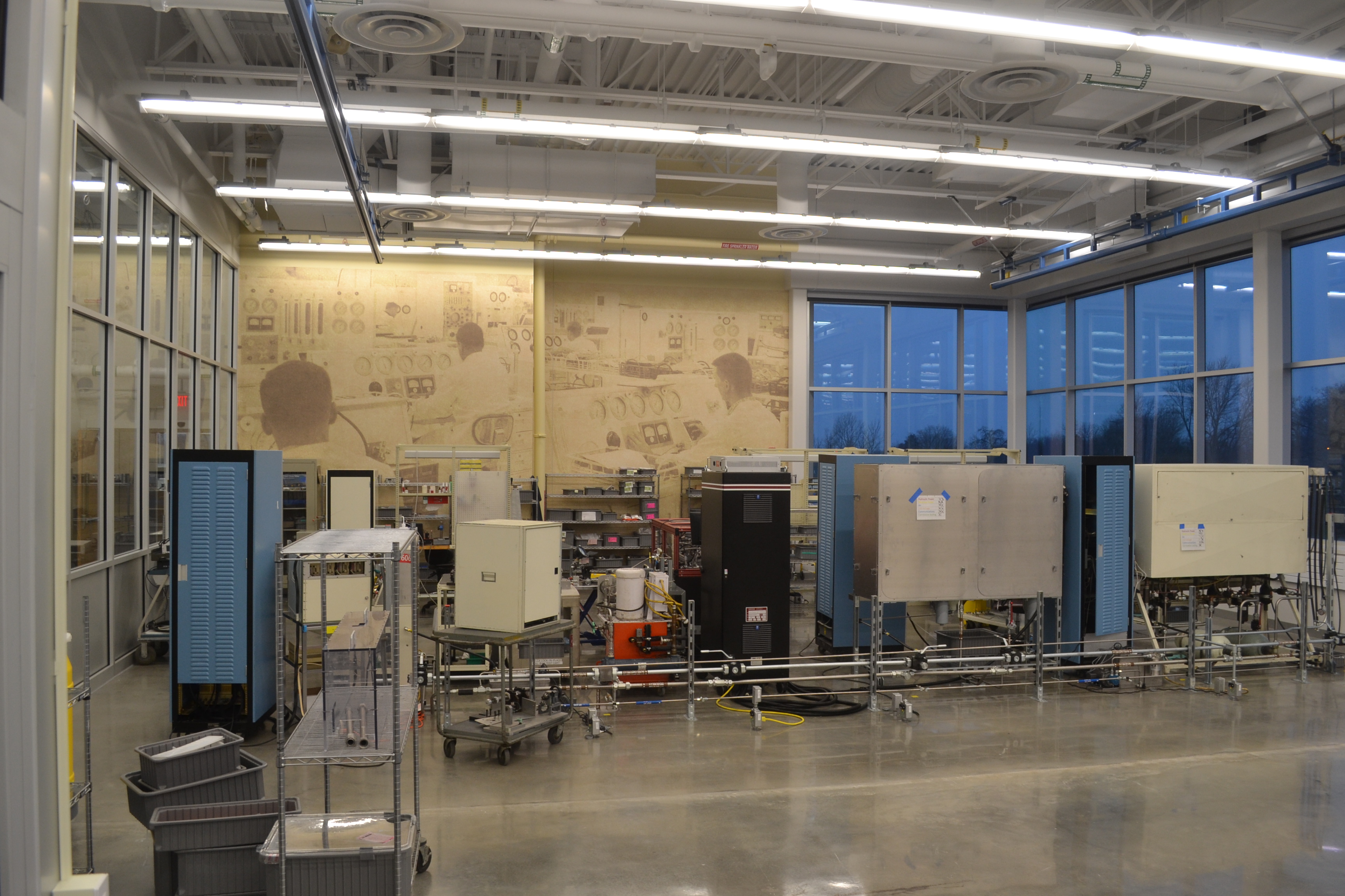 The lower level of the A&T space houses hydraulic pump rooms and an intricate network of hydraulic piping and shop air to feed the various test stand and workstations on both the upper and lower levels. In-slab walker duct system was utilized to distribute power and data to support the client’s need for an open floor plan with maximum long-term flexibility.