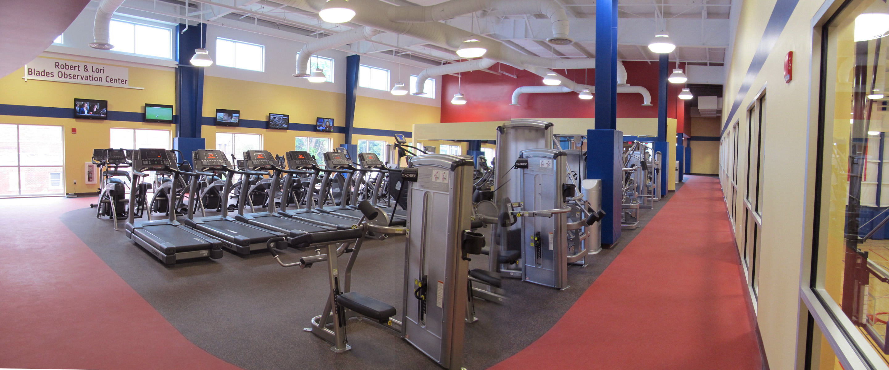 The second floor strategically places the wellness / fitness area over the lockers, allowing interior views of both the Main Gym and the future Natatorium. The wellness area is designed as a high-bayed open floor plan to accommodate a 1/13 mile perimeter walking track circumscribing a cardio theater and a free weights area. An aerobics and dance studio is augmented, for programming dexterity, with an adjacent, smaller-scale flexible studio.